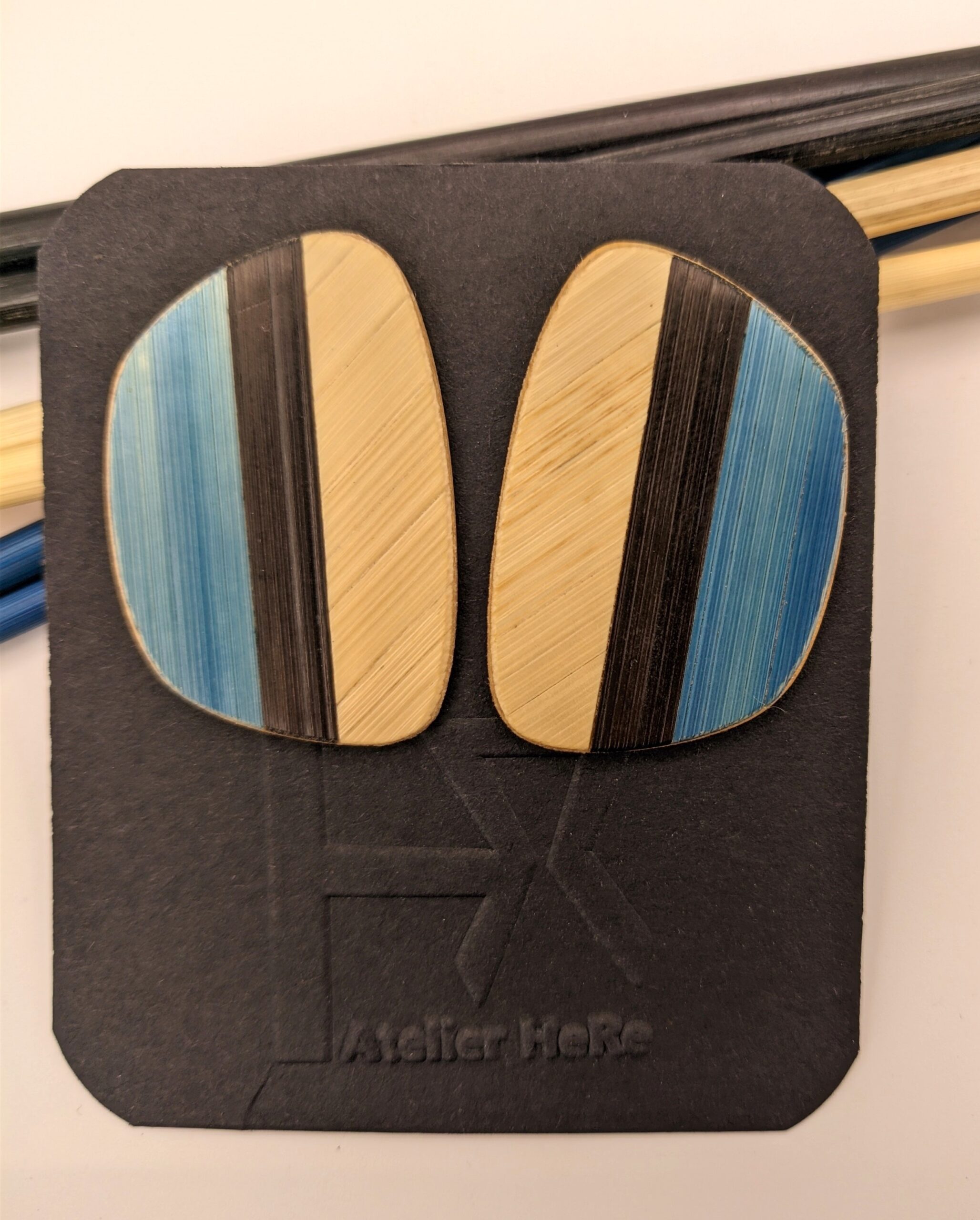 Ces bijoux sont composés de pétales (trois fines couches de placage bois collées) d’une épaisseur finale d’environ 2mm. Ces contrecollés ont les fibres croisées ce qui apporte une grande solidité tout en conservant une grande légèreté.